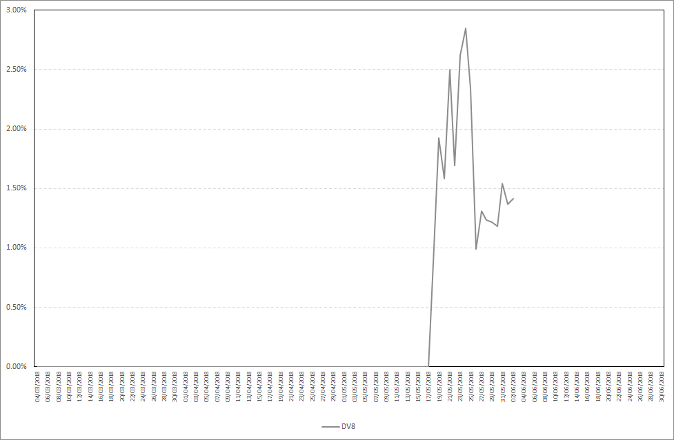 DV7 was finally swapped for DV8! As you can see, DV8 starts staking the next day after you deposit it. Maximum daily stake profit in the period from 27.05.2018-02.06.2018 was 1,54% , while the average daily stake profit was 1,32%. Detailed results are presented on the chart below.