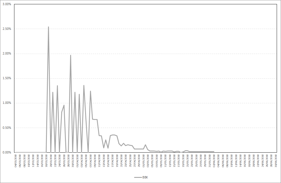 As you can see, BBK takes approximately 3 days to start staking. Maximum daily stake profit in the period from 27.05.2018-02.06.2018 was 0,02%, while the average daily stake profit was 0,02%. Detailed results are presented on the chart below.