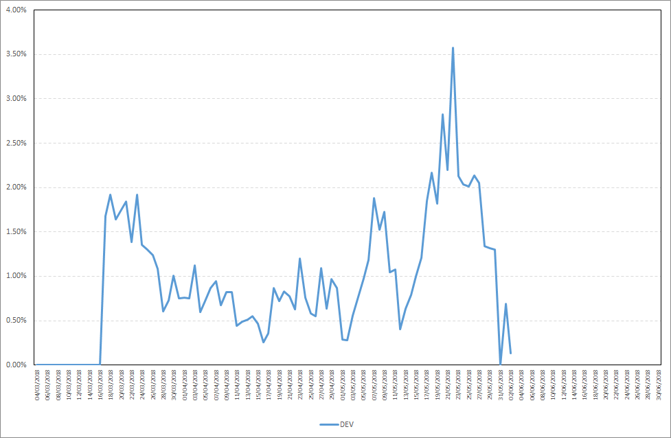 As you can see, it took me almost 2 days to receive first stakes for DEV. Maximum daily stake profit in the period from 27.05.2018-02.06.2018 was 2,05%, while the average daily stake profit was 0,98%. Detailed results are presented on the chart below.