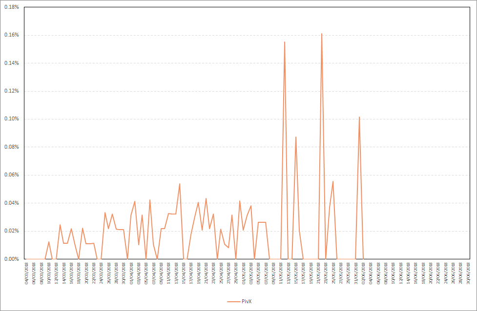 PIVX is a slightly different beast in terms of staking. In this case it takes some time for the coins to mature. But don't be worried, they will mature. In my case, it took 6 days to get the first stake. Maximum daily stake profit in the period from 27.05.2018-02.06.2018 was 0,10%, while the average daily stake profit was 0,01%. This one is known to skip staking for a day or two. But, that's PIVX and I'm still not giving up on holding on tight. The staking history might have not been updated for a few days and a lot of stakes have gone to 01.06.2018. Detailed results are presented on the chart below.