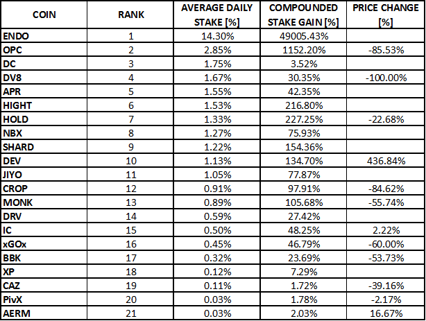 The cryptocurrencies in my portfolio which have already started staking are included in the following table. Top performers are ranked according to average daily staking profit. Compounded stake gains are also shown. In this analysis I have also included an indication on the price change – a relative change in the moment of writing this analysis compared to the moment when I acquired the cryptocurrency.