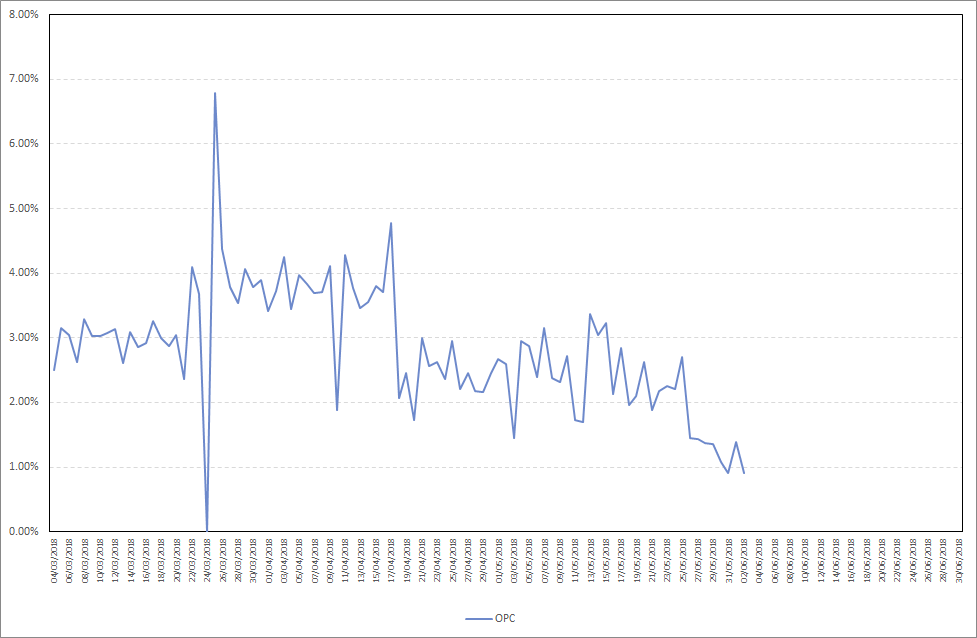 As you can see, OPC also starts staking almost immediately after your stake is included in the wallet during daily wallet maintenance. Maximum daily stake profit in the period from 27.05.2018-02.06.2018 was 1,43%, while the average daily stake profit was 1,20%. Detailed results are presented on the chart below.