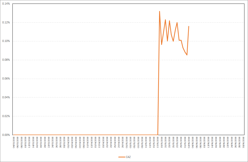 As you can see, CAZ starts staking after almost three days. Maximum daily stake profit in the period from 27.05.2018-02.06.2018 was 0,12%, while the average daily stake profit was 0,10%. Detailed results are presented on the chart below.