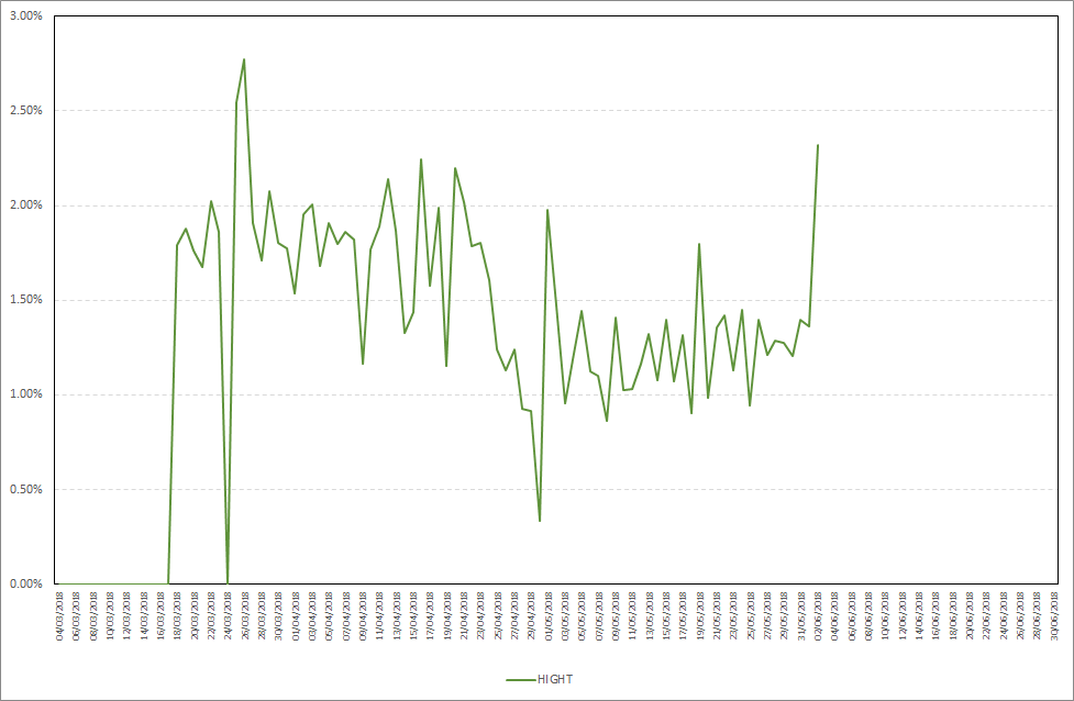 As you can see, HIGHT starts staking almost immediately after your stake is included in the wallet. Maximum daily stake profit in the period from 27.05.2018-02.06.2018 was 2,32%, while the average daily stake profit was 1,44%. Detailed results are presented on the chart below.