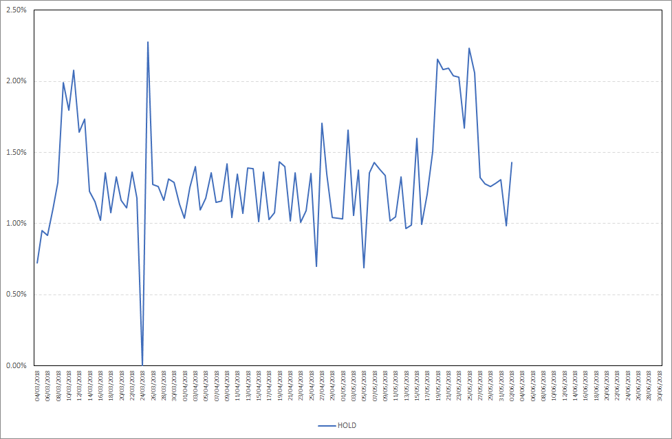 As you can see, HOLD starts staking almost immediately after your stake is included in the wallet during daily wallet maintenance. Maximum daily stake profit in the period from 27.05.2018-02.06.2018 was 1,43%, while the average daily stake profit was 1,27%. Detailed results are presented on the chart below.