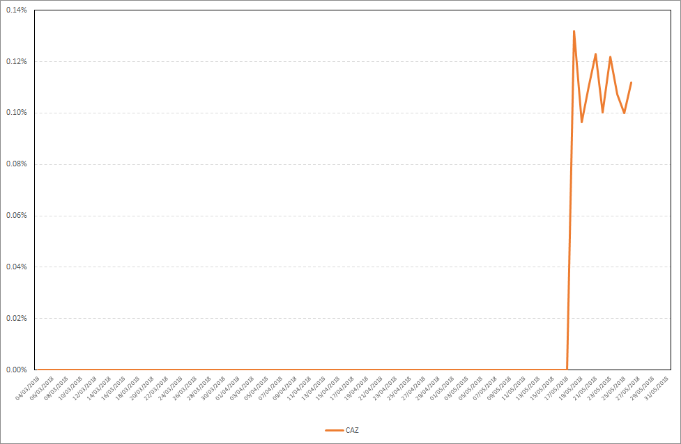 As you can see, CAZ starts staking after almost three days. Maximum daily stake profit in the period from 20.05.2018-26.05.2018 was 0,12%, while the average daily stake profit was 0,11%. Detailed results are presented on the chart below.