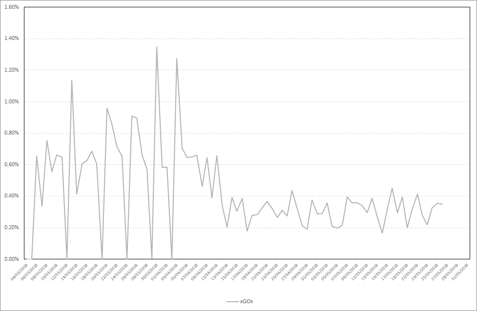 As you can see, XGOX also starts staking almost immediately after your stake is included in the wallet during daily wallet maintenance. Maximum daily stake profit in the period from 20.05.2018-26.05.2018 was 0,41%, while the average daily stake profit was 0,32%. Detailed results are presented on the chart below.