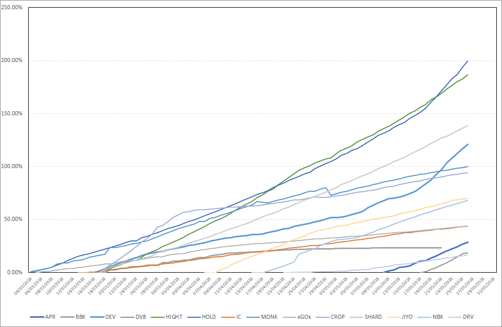 On 26.05.2018, my portfolio was not changed compared to the previous analysis (here). The coins included in the portfolio are: AERM (Aerium), APR (APR Coin), BBK (BitBlocks), CAZ (Caz coin), CROP (CropCoin), DEV (Deviant Coin), DRV (Dravite), DV8 (DV8 coin), ENDO (Endocoin), HIGHT (High Coin), HOLD (Interstellar Holdings), IC (Ignition Coin), JIYO (JIYO), MONK (Monkey Project), NBX (Nibex Cash), OPC (OP Coin), PIVX, SHARD (Shard), XGOX and XP (Experience points).