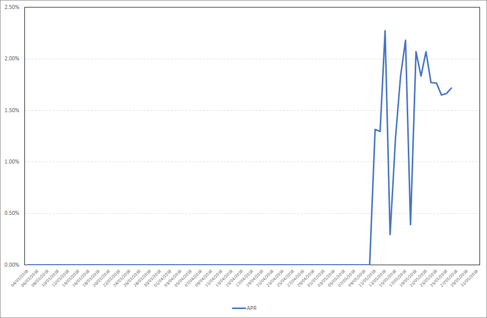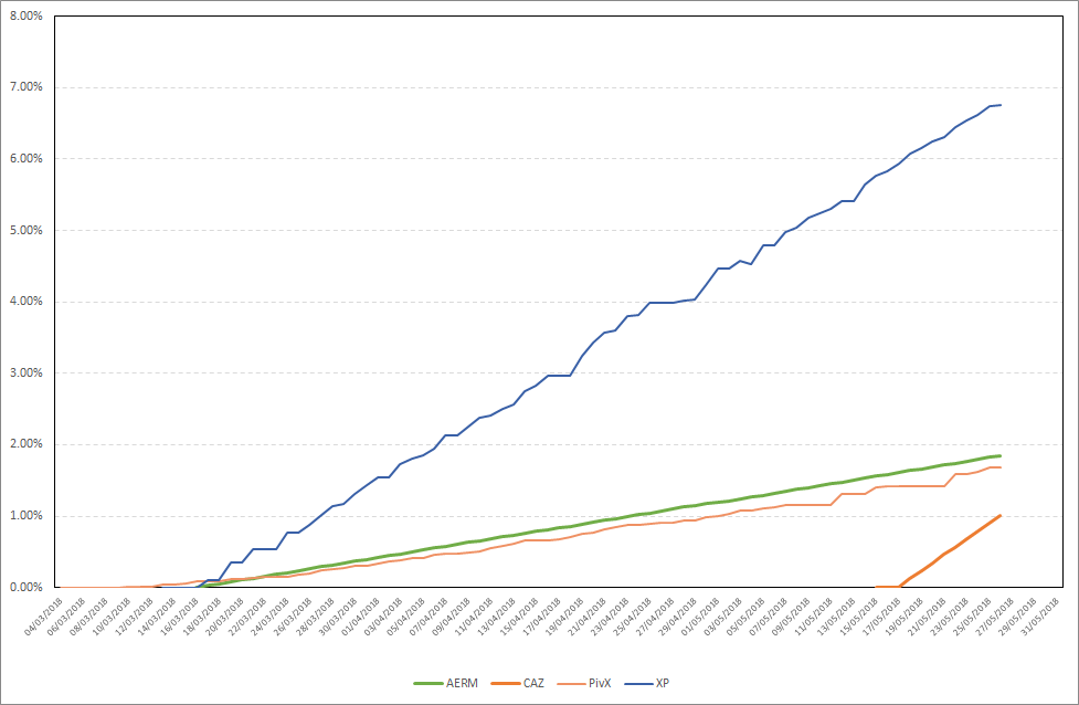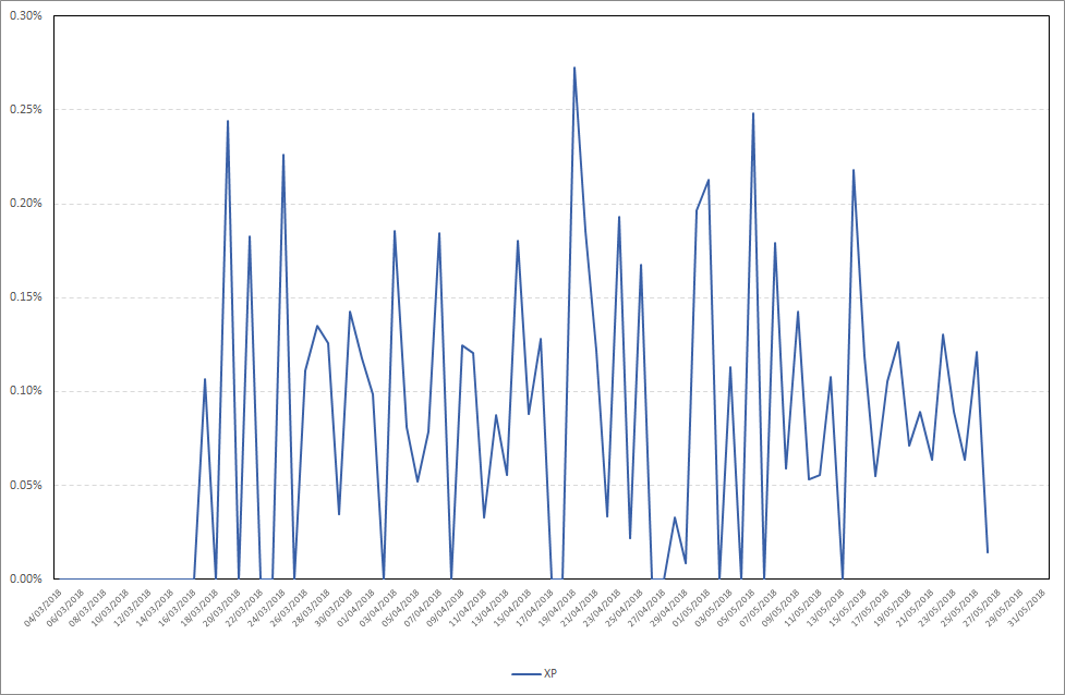 As you can see, XP took a while before giving a first stake, I was waiting for 4 days. Maximum daily stake profit in the period from 20.05.2018-26.05.2018 was 0,13%, while the average daily stake profit was 0,08%. Detailed results are presented on the chart below.