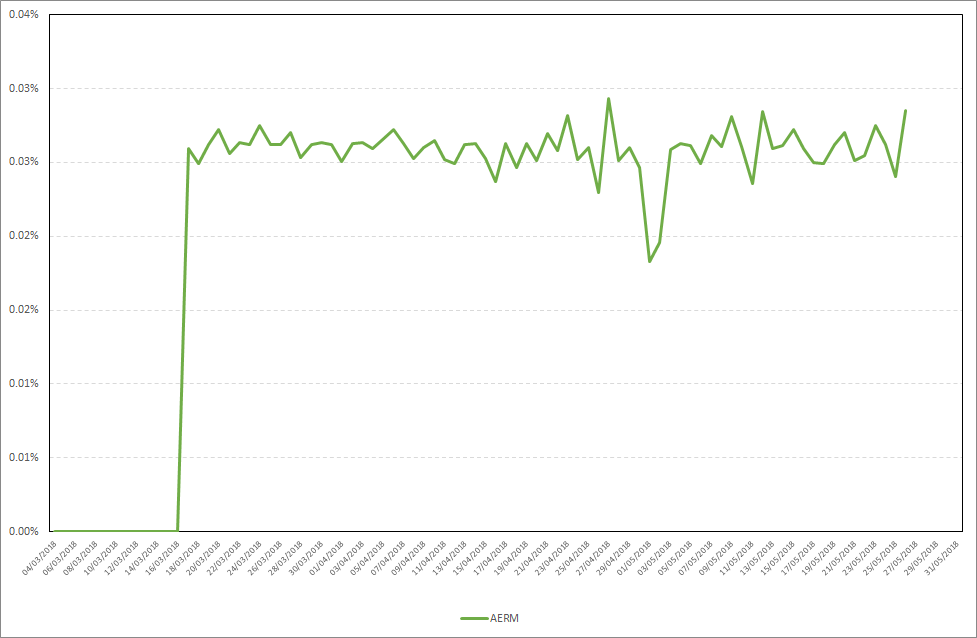 As you can see, AERM starts staking almost immediately after your stake is included in the wallet. Maximum daily stake profit in the period from 20.05.2018-26.05.2018 was close to 0,03%, while the average daily stake profit was 0,03%. Detailed results are presented on the chart below.