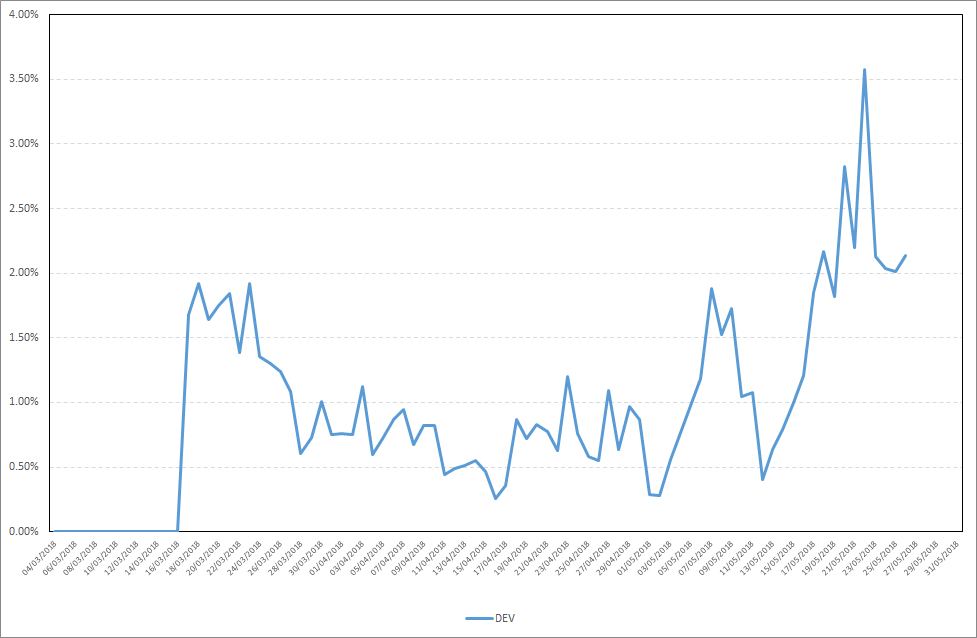 As you can see, it took me almost 2 days to receive first stakes for DEV. Maximum daily stake profit in the period from 20.05.2018-26.05.2018 was 3,58%, while the average daily stake profit was 2,42%. Detailed results are presented on the chart below.