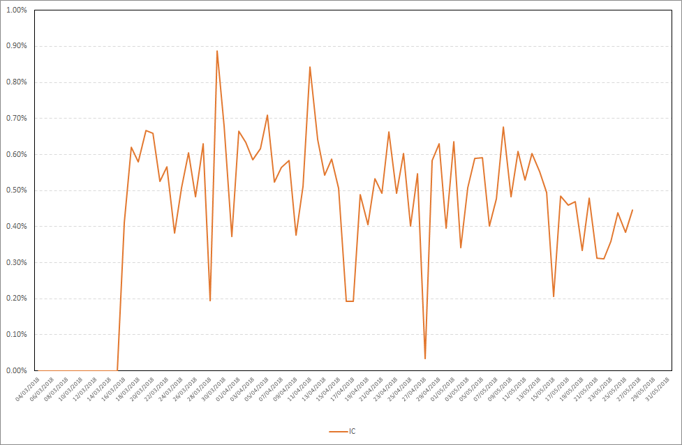 As you can see, IC starts staking almost three days after your stake is included in the wallet. Maximum daily stake profit in the period from 20.05.2018-26.05.2018 was 0,48%, while the average daily stake profit was 0,39%. This is still one of my favorite coins. Detailed results are presented on the chart below.