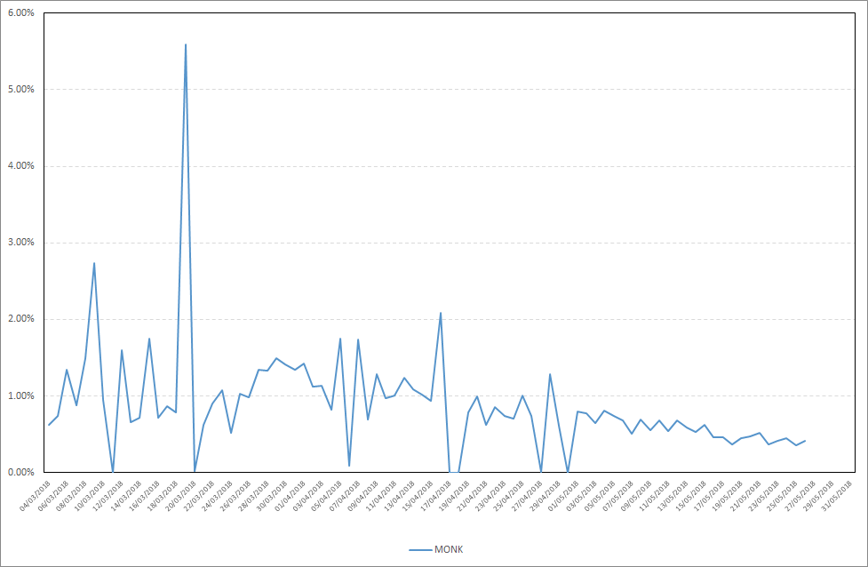 As you can see, MONK also starts staking almost immediately after your stake is included in the wallet during daily wallet maintenance. Maximum daily stake profit in the period from 20.05.2018-26.05.2018 was 0,52%, while the average daily stake profit was 0,43%. Detailed results are presented on the chart below.