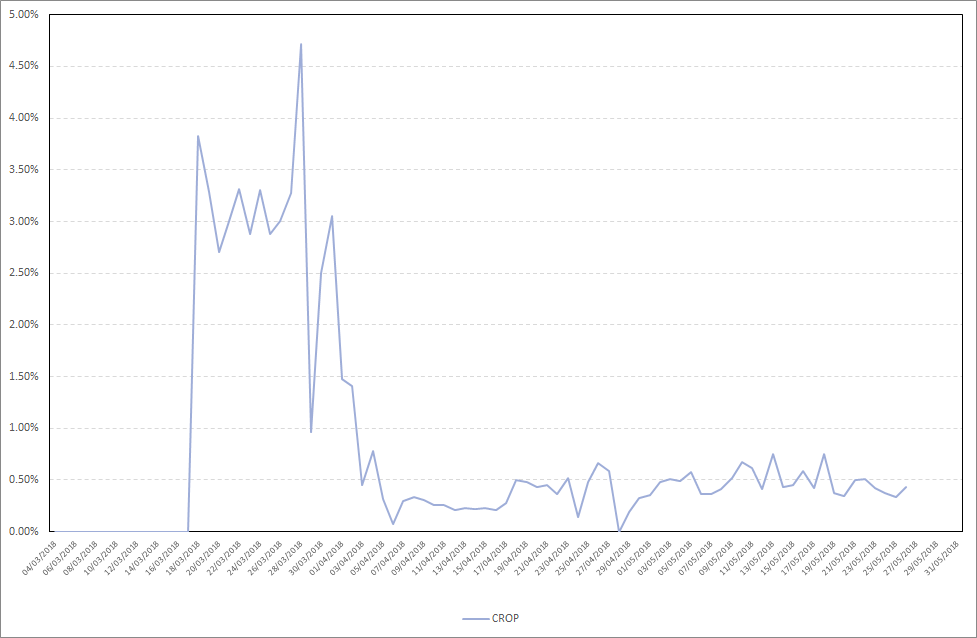 As you can see, CROP starts staking almost immediately after your stake is included in the wallet. Maximum daily stake profit in the period from 20.05.2018-26.05.2018 was 0,35%, while the average daily stake profit was 0,42%. Detailed results are presented on the chart below.