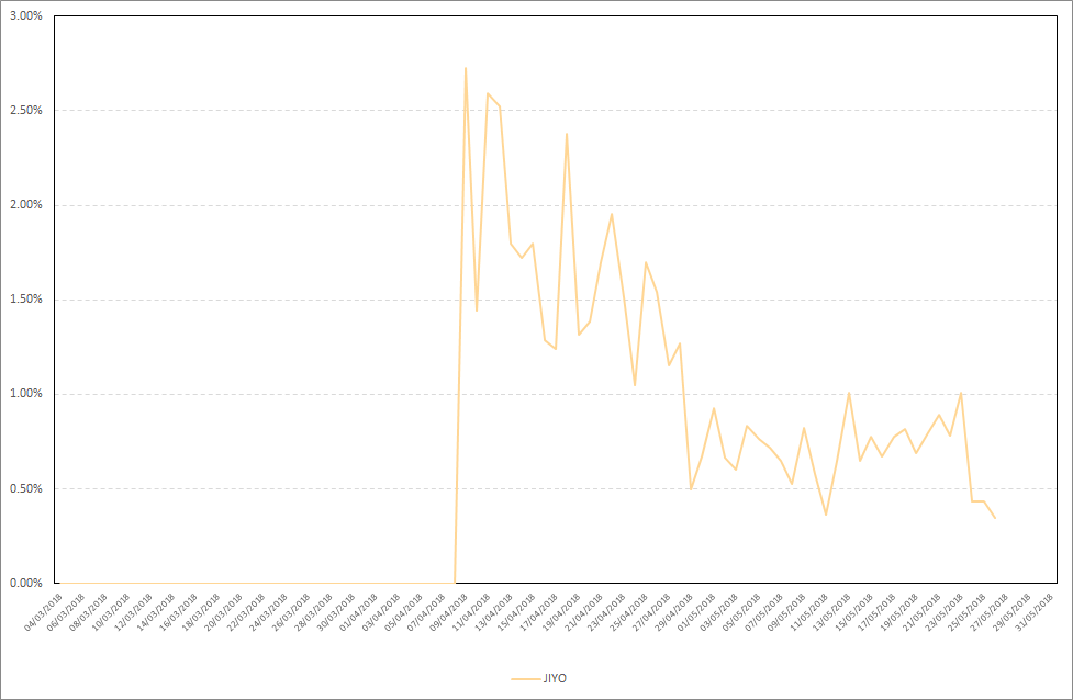 As you can see, JIYO starts staking almost two-three days after your stake is included in the wallet. Maximum daily stake profit in the period from 20.05.2018-26.05.2018 was 1,01%, while the average daily stake profit was 0,67%. Detailed results are presented on the chart below.