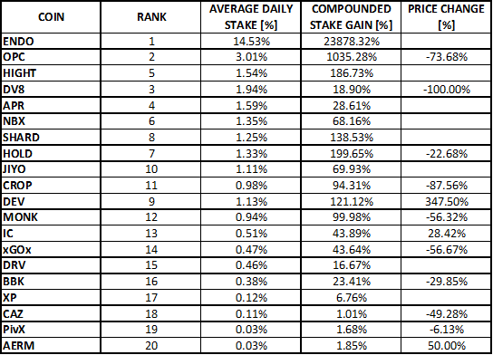 The cryptocurrencies in my portfolio which have already started staking are included in the following table. Top performers are ranked according to average daily staking profit. Compounded stake gains are also shown. In this analysis I have also included an indication on the price change – a relative change in the moment of writing this analysis compared to the moment when I acquired the cryptocurrency.