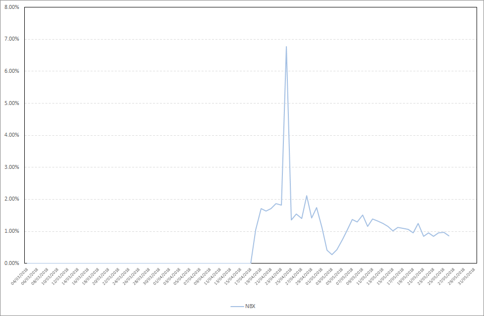 As you can see, NBX took almost three days to start staking. Maximum daily stake profit in the period from 20.05.2018-26.05.2018 was 1,25%, while the average daily stake profit was 1,09%. Detailed results are presented on the chart below.