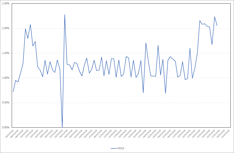 As you can see, HOLD starts staking almost immediately after your stake is included in the wallet during daily wallet maintenance. Maximum daily stake profit in the period from 20.05.2018-26.05.2018 was 2,23%, while the average daily stake profit was 2,03%. Detailed results are presented on the chart below.