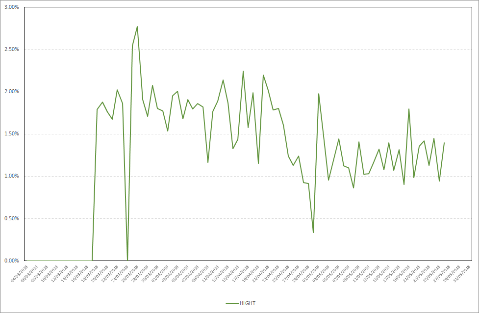 As you can see, HIGHT starts staking almost immediately after your stake is included in the wallet. Maximum daily stake profit in the period from 20.05.2018-26.05.2018 was 1,45%, while the average daily stake profit was 1,24%. Detailed results are presented on the chart below.