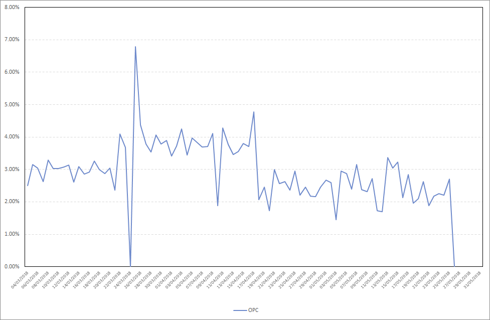 As you can see, OPC also starts staking almost immediately after your stake is included in the wallet during daily wallet maintenance. Maximum daily stake profit in the period from 20.05.2018-26.05.2018 was 2,70%, while the average daily stake profit was 1,98% (one data point missing at the time of writing). Detailed results are presented on the chart below.