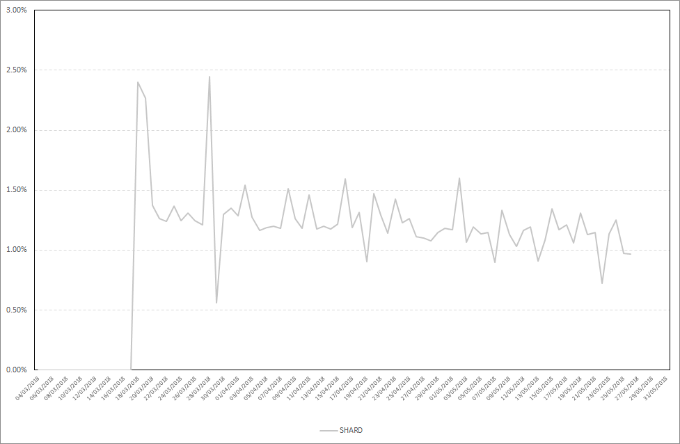 As you can see, SHARD also starts staking almost immediately after your stake is included in the wallet during daily wallet maintenance. Maximum daily stake profit in the period from 20.05.2018-26.05.2018 was 1,25%, while the average daily stake profit was 1,05%. Detailed results are presented on the chart below.