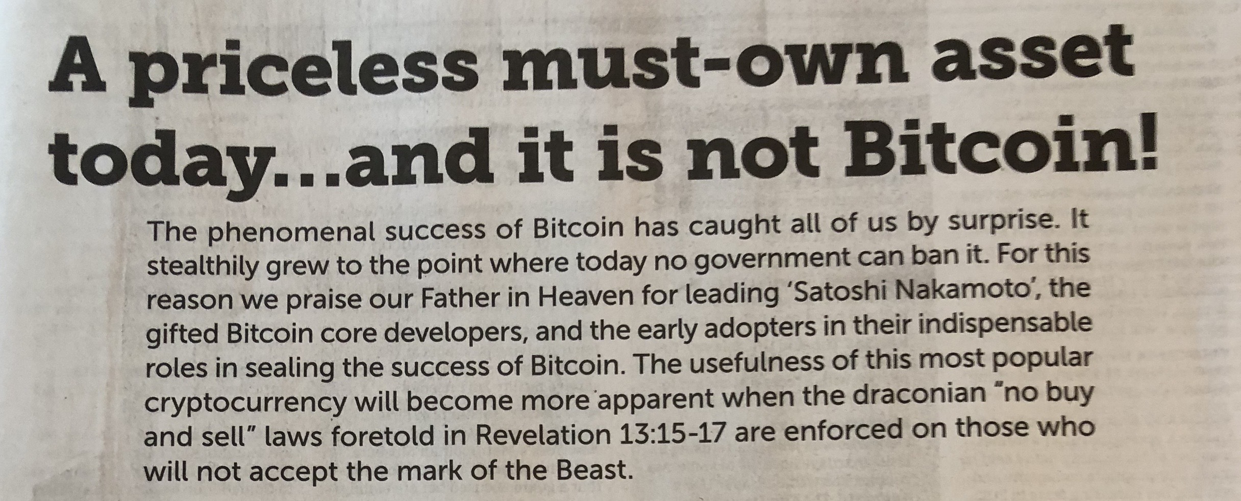 A very enjoyable read! Is that QR code at the bottom of the article for some kind of wallet (haha)? No matter what you believe, it is important to remember that Bitcoin, money, and all earthly possessions are limited in scope (temporal) when compared to one's morals, humanity, and spirituality.
