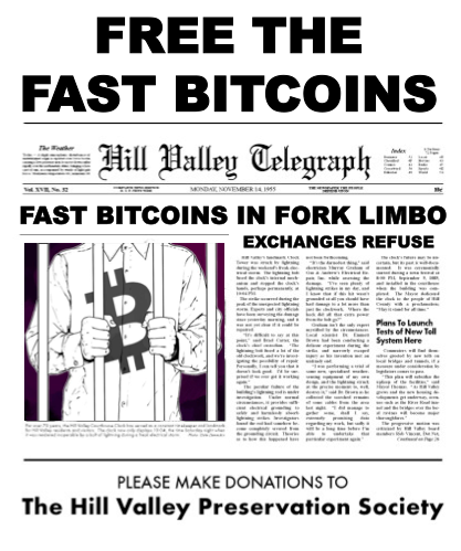 Doc Brown: Say, where's that old clock tower flyer you keep in your backpack Marty? ... Look at this! Just as I thought! See how the printing has changed already! The effects of the fork are already starting to ripple out across time. Demand and outrage at exchanges refusing to release the supercoins is already building!