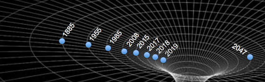 I'll explain later. Marty listen to me closely. We're approaching a singularity in the space-time continuum. The closer we get to 2019 the closer these nexus points get to each other. There were 70 years between 1885 and 1955, 30 more to 1985, 23 to 2008, 7 to 2015, 2 to this one, August 1 through 21, 2017! Then the next two are just 15 and 10 months after that! My time machine can't get any closer to 2020 than about June 2019!