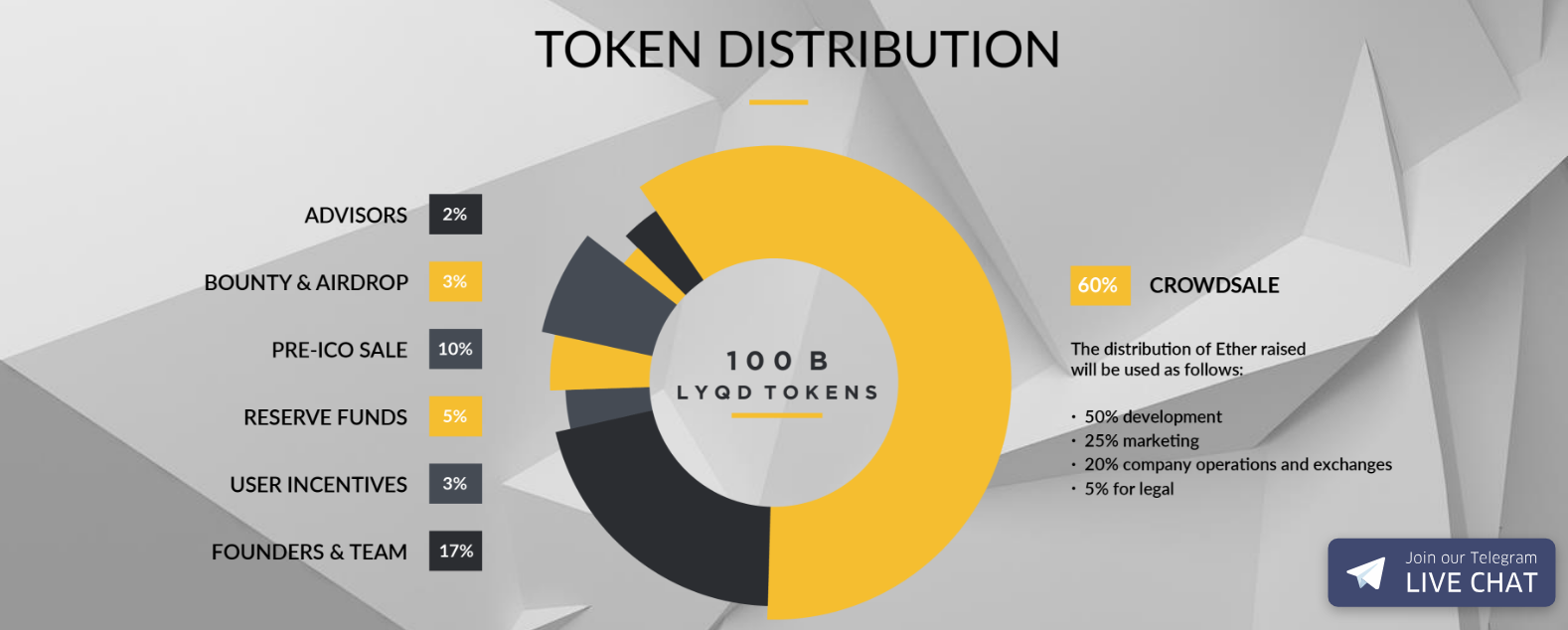eLYQD utility token: Payments within the eLYQD ecosystem will be effected in the system's own crypto-tokens—LYQD, ERC20-compliant. The function of the token will be to reward users for active use of the ecosystem and contributions to its development (rewards include several types of crypto-paybacks, loyalty, promotions).