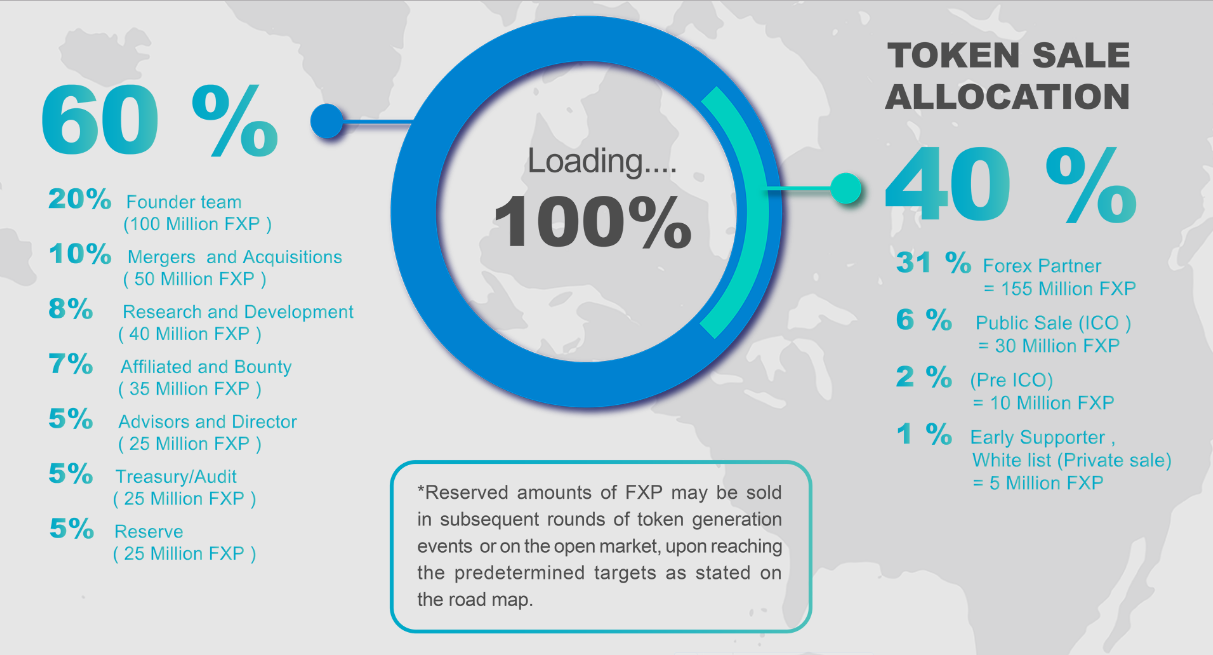 The supply of FXP Tokens is capped of 500 million, and is allocated as follows :
