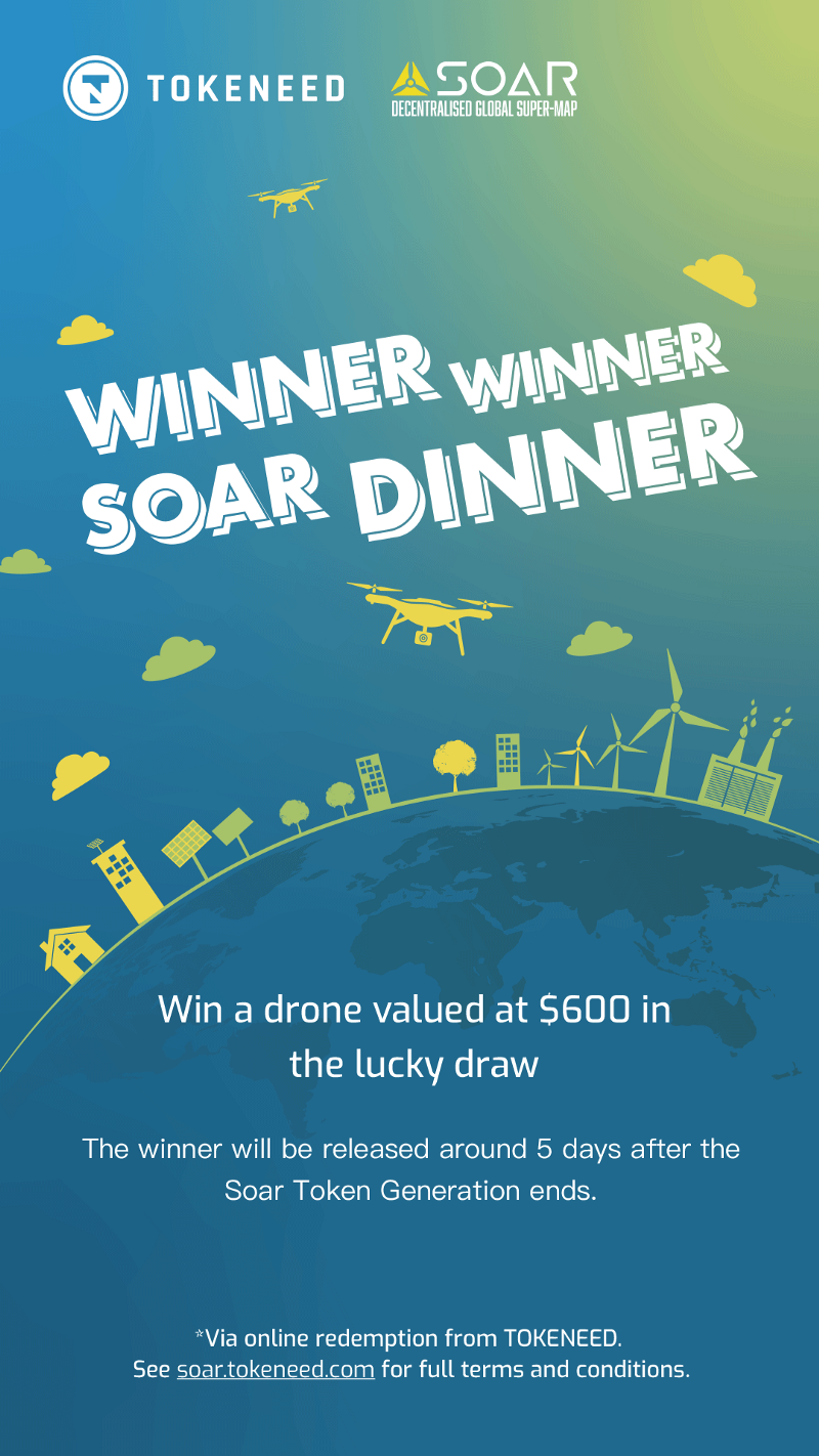 We are giving away a $629 drone to SOAR TGE participants in our lucky draw event! The winner will be announced 5 days after the Soar Token Generation ends. You can sign up at www.tokeneed.com.