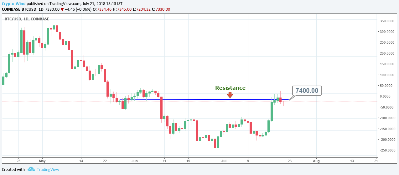 BTC is now trading around 7350$ after facing resistance at 7700$.