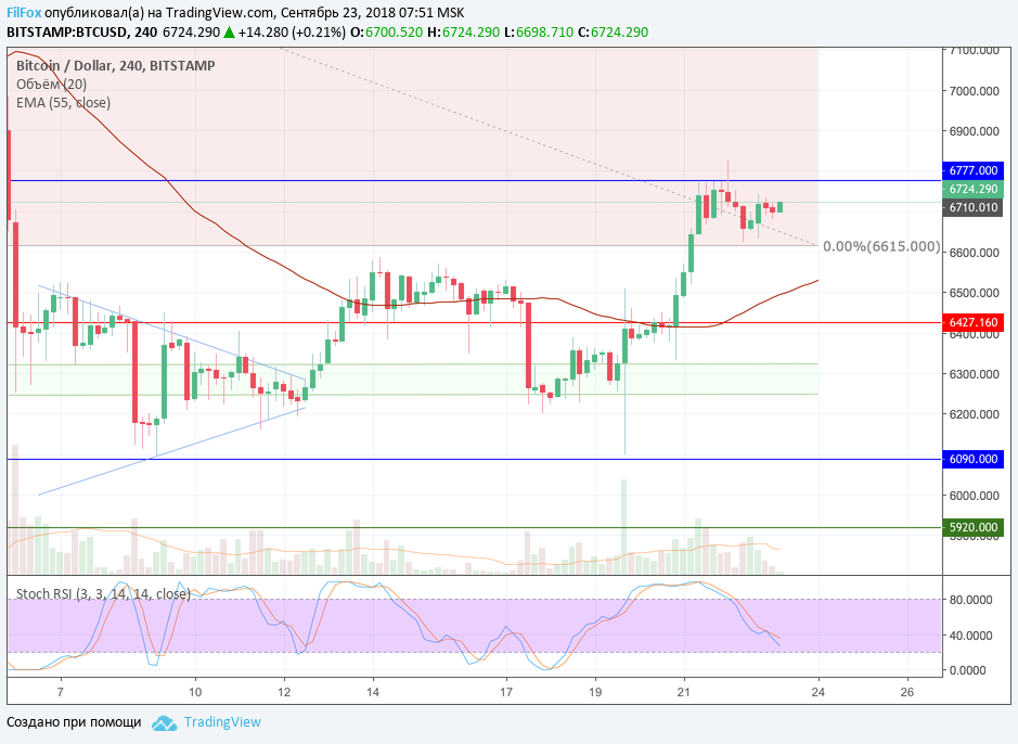 This Friday, resistance at the key level of 6427.16 USD was overcome and, continuing growth yesterday, the price tested the level of 6777.00 USD. However, the low transaction volumes and the lack of activity of buyers in the market prevented this resistance from penetrating. The pair retreated to support the Fibonacci zero level of $ 6615.00 and is further consolidating in this range.