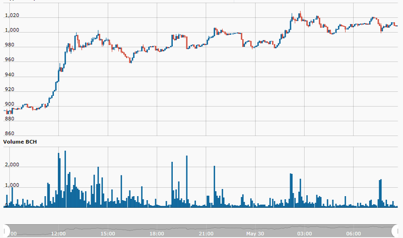 The Bitcoin Cash price is sitting at $1,009 representing a positive change of 13.02% in the last 24 hours. More than $110 Mln worth of BTC were exchanged in the BCH/USD market representing a 23.9% share of the global daily volume. The biggest Bitcoin Cash pair is the BCH/BTC pair, that represents a 34.6% share.