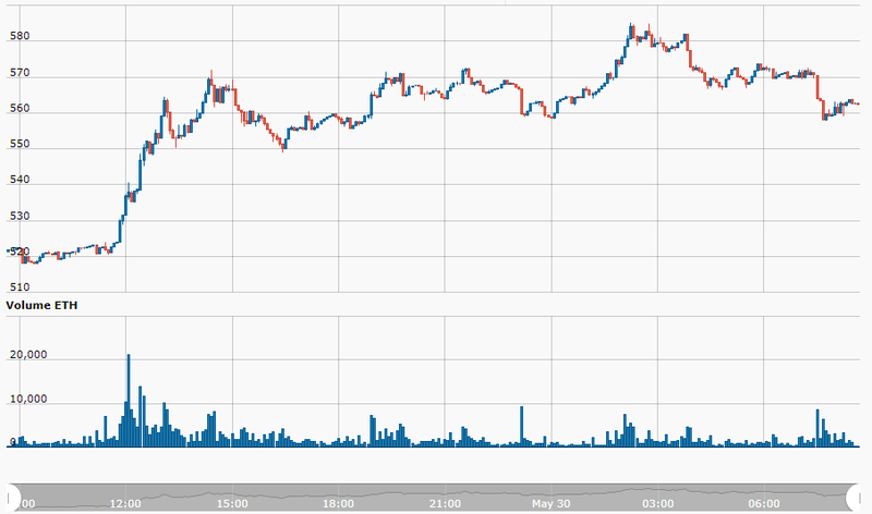 The Ethereum price has risen 7.68% over the past 24 hours and is currently sitting at $562, with over $350 M worth of Ether exchanged in the past 24 hours on the ETH/USD pair which has a 34.1% market share of the daily trading volume.