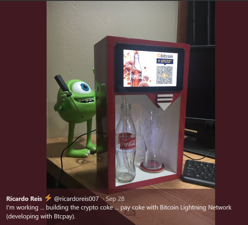 Spanish hardware hacker, Ricardo Reis, sows us how easy it is to buy Coca Cola from a vending machine with Bitcoins. Reis built a Coca Cola vending machine to demonstrate payment via the Bitcoin lightning network that is compatible with our daily lives.