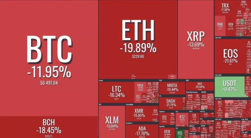 数字货币市场紧跟币王脚步,哀嚎不断。Coinmarketcap网站统计,除稳定币Tether(USDT)外,其余九大数字货币最近24小时均累跌,第二大数字货币以太币(ETH)等七只货币均有两位数下跌,跌幅都超过10%,跌幅最大的EOS下跌近17%。
