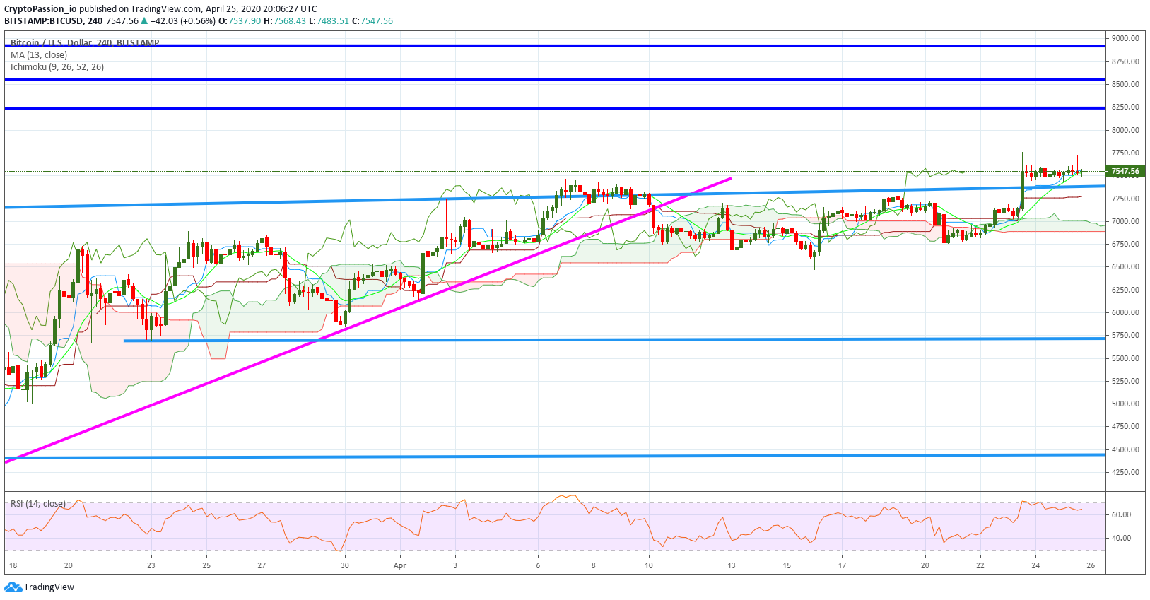 Today Bitcoin (BTC) price briefly popped above $7,700, suggesting the reminder of the weekend, along with the weekly close will provide higher than normal levels of excitement. The move to $7,708 was short lived but nearly set a higher high above Thursday’s impressive surge to $7,742. At the time of writing, Bitcoin price is trading sideways between $7,500-$7,569 as traders attempt to press the price above $7,600.