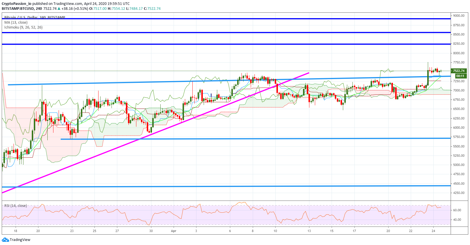 After the break of the resistance line of 7340$, we are consolidating just upper, preparing the next move. Most of the time, I don't like a patter where we stay just next the major resistance line we just broken. When a major resistance line is broken, we must have a nice move because lot of buyers are waiting that this line is broken to trigger they buy order. So if we still stay just next, it means that this level is not interesting the traders and that we are waiting for a possible move to enter, but no one is sure about the direction of that move, this is the difficulty.