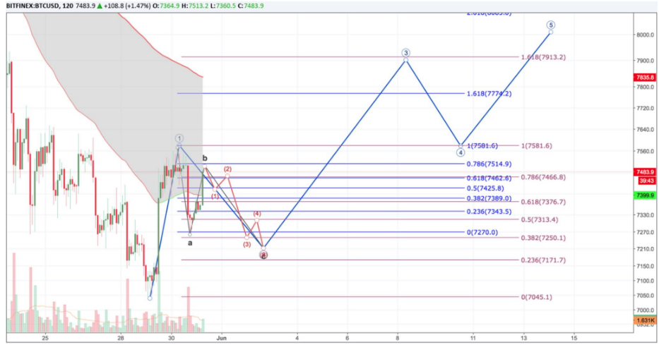 The second one is more bearish SHORT TERM but more bullish long term. It assumes we have not yet started our 3rd wave up, but that we are still in wave 2 and have completed the AB of the ABC correction. Deeper retrace (possible 7.1) but higher wave 5, possibly testing 8K. Also slow and lots of sideways movement.