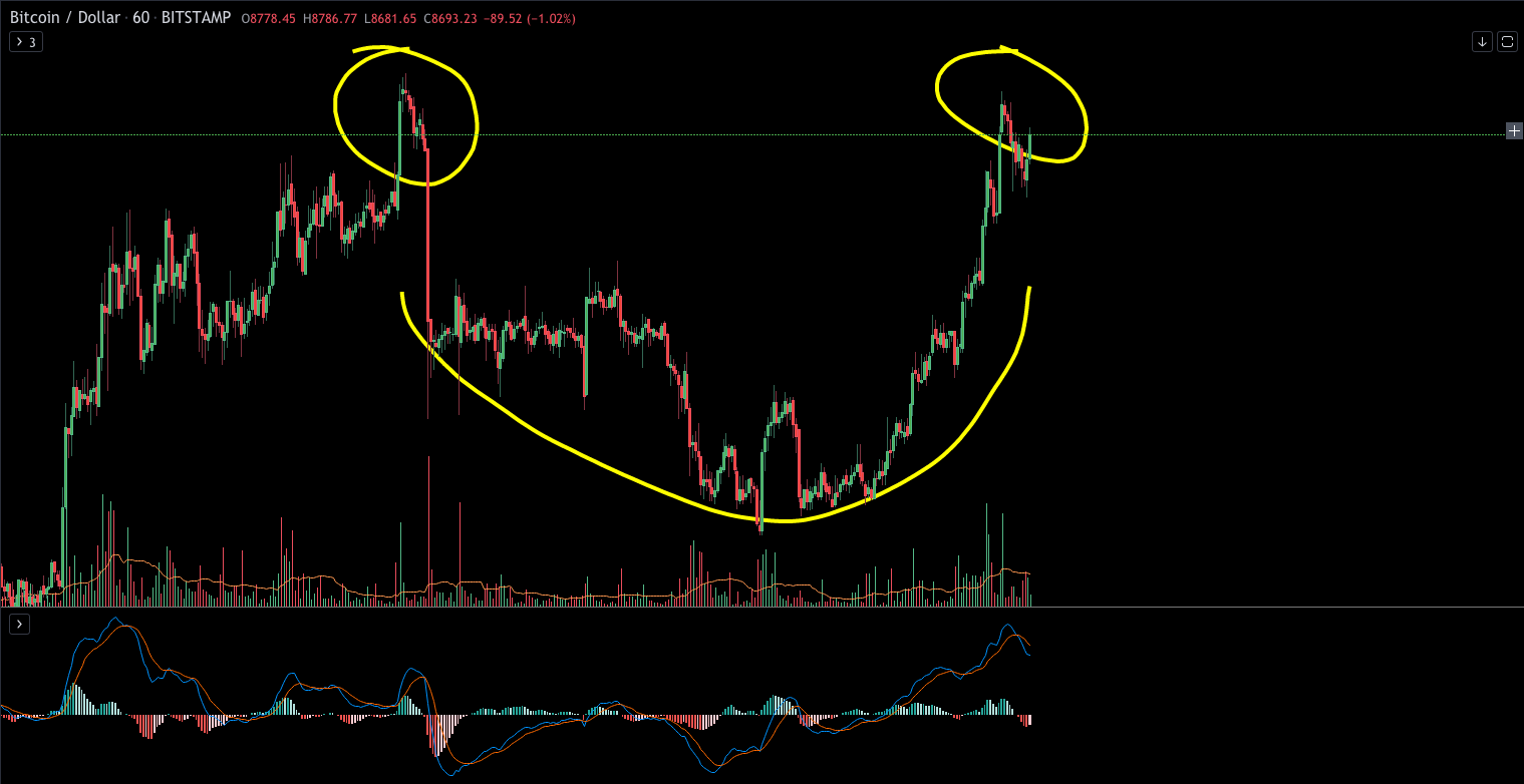 what is going on with bitcoin? it looks like a rounding bottom double top formation on the hourly :D