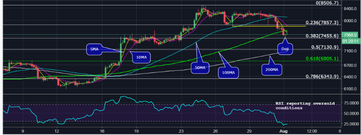 The above diagram demonstrates BTC has made a doji light at the key help of $7,455 (38.2 percent Fibonacci retracement), showing uncertainty in the market.