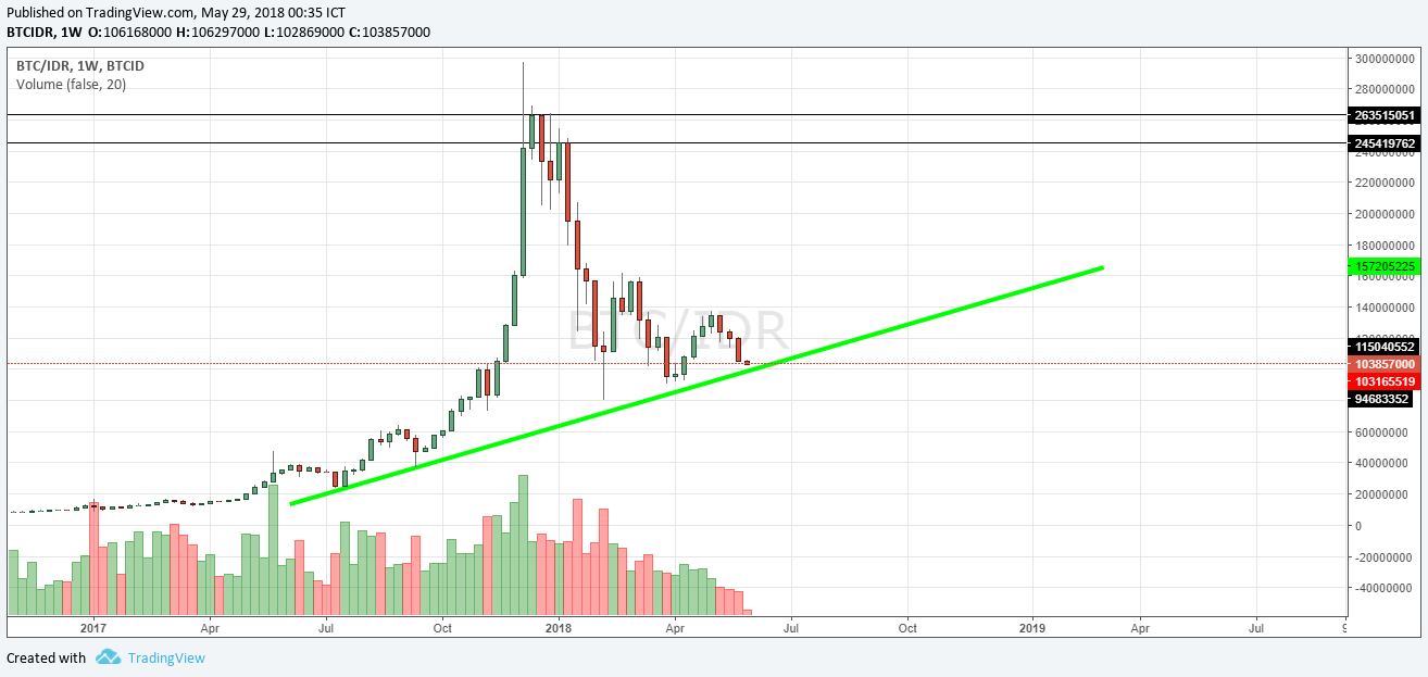 As you can see, in bigger time frame (weekly), We are in a giant bull run. Just look at the trend line (green). It is not possible that bitcoin can reach 150 million IDR (10000 USD-ish) minimum by the end of 2018.