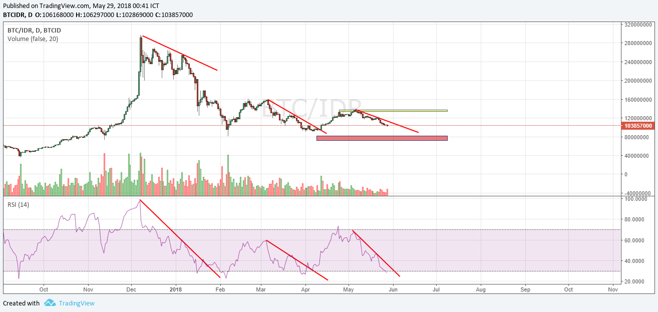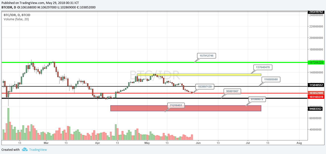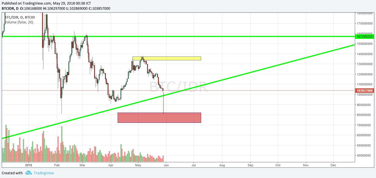Using levels I have been fine-tuning now, we are actually testing the 104 million IDR level (red line). It is very likely that we will go down further to around 96 million IDR (black line further below, and even to the red area (around 71 - 82 million IDR). I would happily buy and spend most of my money if bitcoin reach the 82 million level. But I would start to get panic if bitcoin still go down below 71 million IDR.