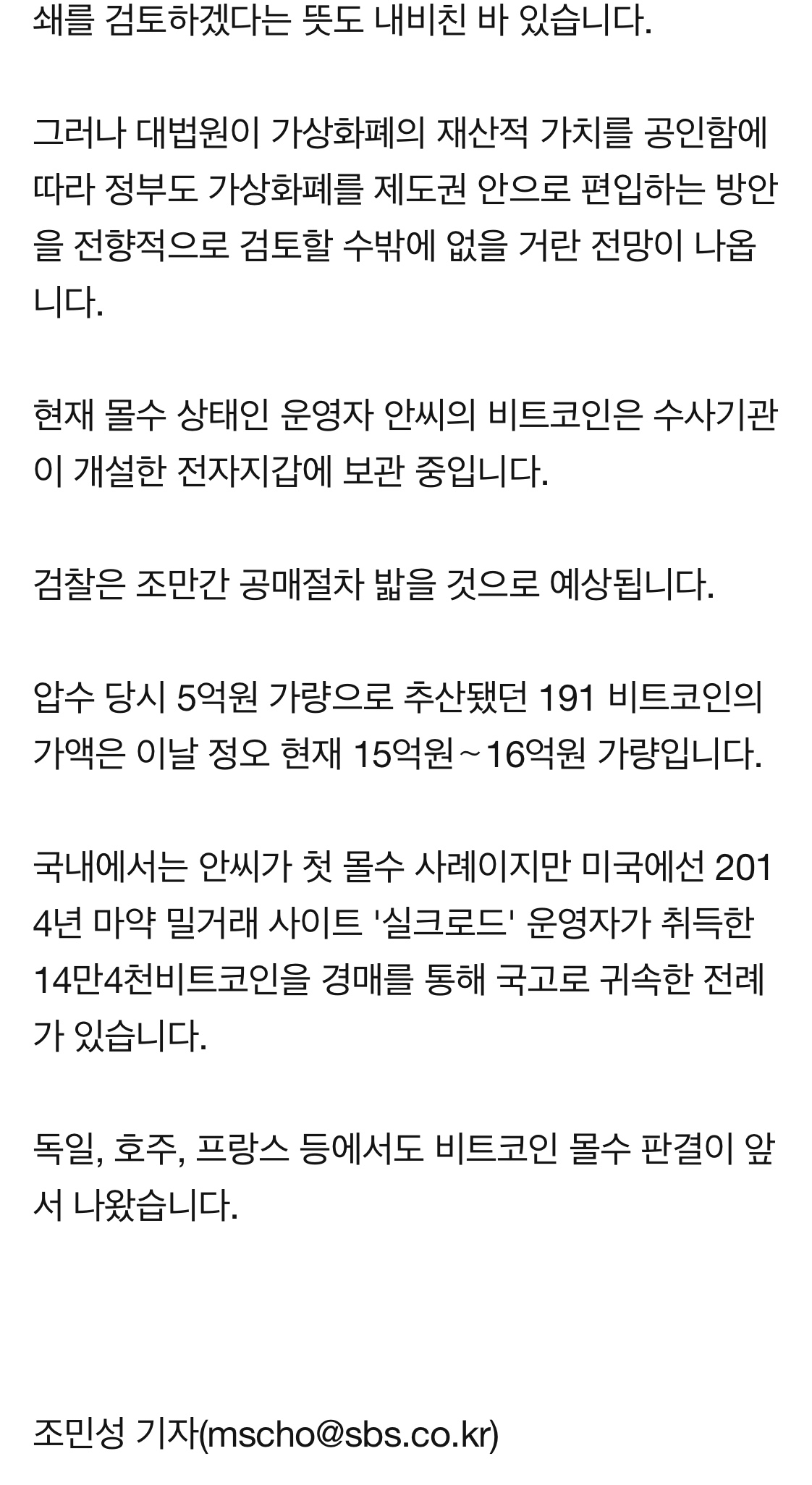 나라에서는 상속할때도 이제 비트코인 얼마 있나 잘 찾아야겠군요 ㅎㅎ 근데 비트코인을 경매라니...걍 시장가에 팔면될텐데 말이죠 ㅋ