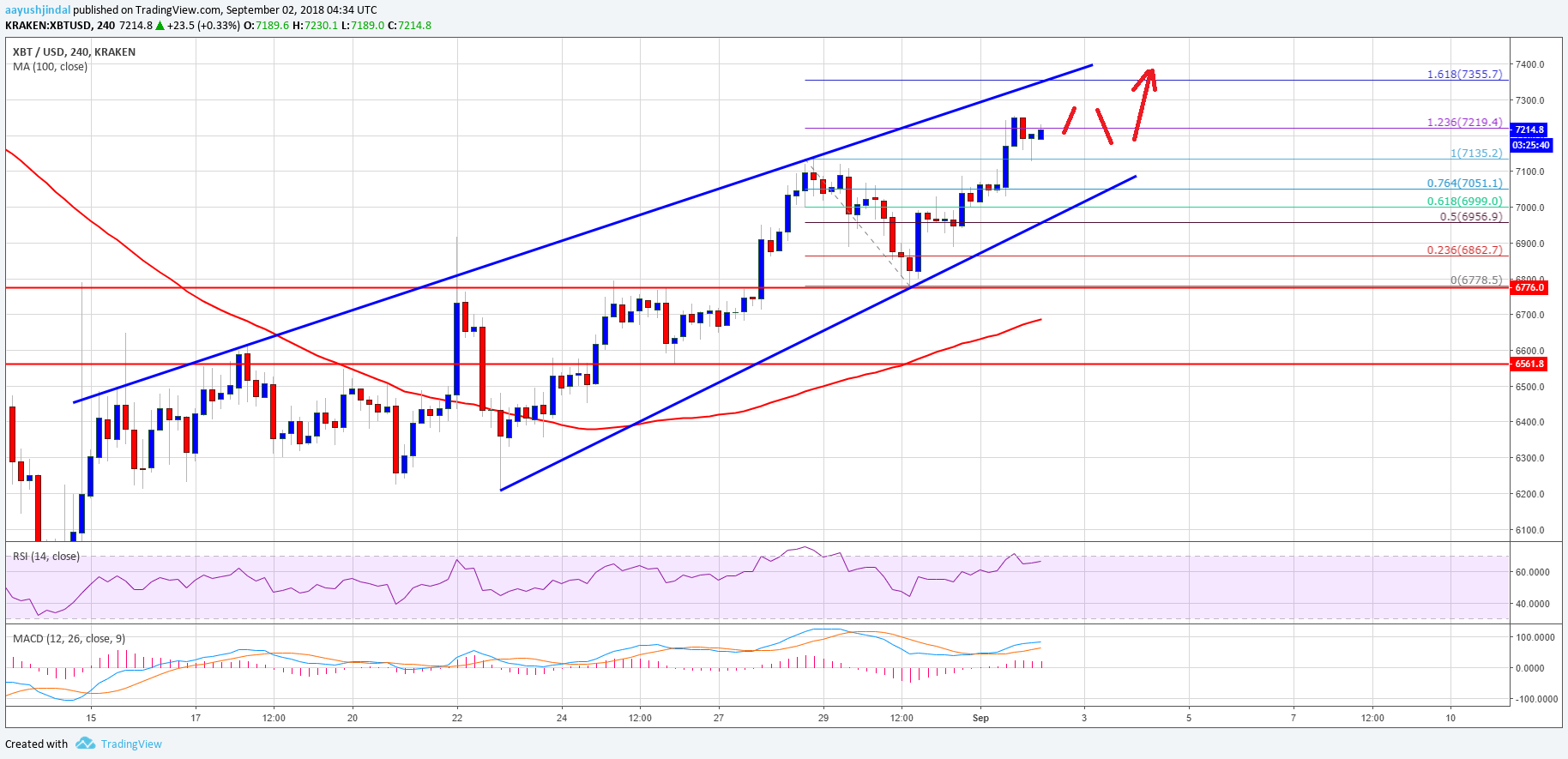 Bitcoin price is gaining strength above the $7,100 level against the US Dollar. BTC/USD buyers are now targeting the $7,300 and $7,400 resistances.