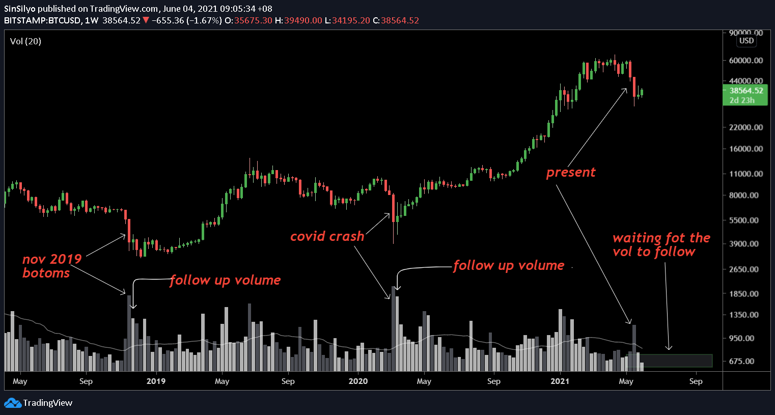 A comparison of past bitcoin correction relative to its volume, on November 2019 bottoms after the big selling volume, the next weekly volume shoot up big higher than volume moving average (white line), the same thing happen during covid crash on march of 2020 a follow up of a big buying volume that break the volume MA. At present correction there were no follow up big buying volume that breaks the volume MA so I'm waiting for that before ill look for a buy set set up trend following strategy, for now I need more confirmation that the bulls are in full control..