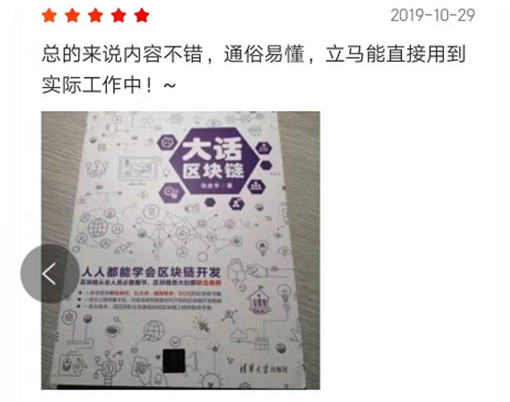 一本书到底质量如何,我觉着读者是最有发言权的。这里我摘录了几个读者的留言。一位读者是将大话区块链看作是区块链的通识读本,这个说法是对大话区块链最高的赞扬;另外一个读者认为这本书通俗易懂,立马可以用到实际工作中,这个说法我强烈赞同,因为当初写大话区块链的时候就是想让大家看完这本书就能开始干活。还有一位读者是单位的技术负责人,给技术人员买了几本书,大家的反映也不错。