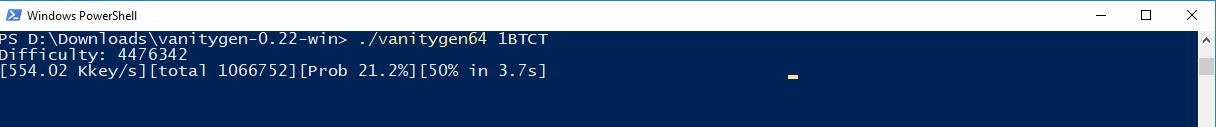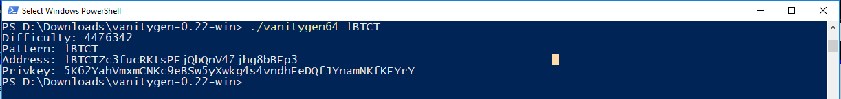 - You can choose either the 32-bit or 64-bit exe file, since I got a 64-bit OS I'll go with the 64-bit. Now think of any characters you want to include, then on the command prompt type ./vanitygen64 1(insert characters here) and hit ENTER.