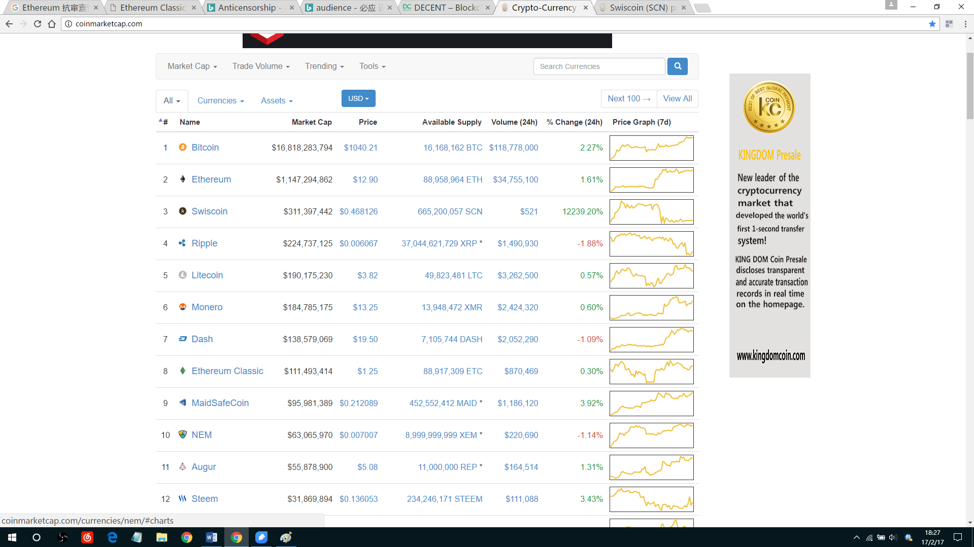 根据我2017.02.17的统计,排名第二的ETH总市值仅占比特币总市值的6.8%。